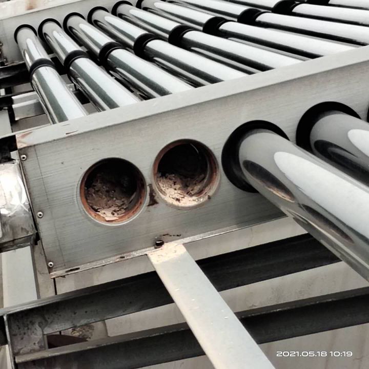 2、未安裝阻垢設(shè)備,導(dǎo)致該設(shè)備沒用幾年真空管全部堵塞,并出現(xiàn)真空管炸裂的現(xiàn)象。
